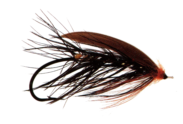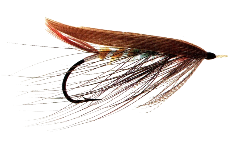 Lady Caroline Spey Fly, originator unknown, early 19th century. Pattern as per George M. Kelson. Tail: Golden pheasant red-breast, a few strands onlyBody: Brown and